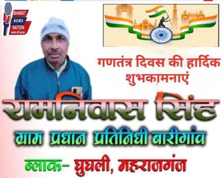 रामनिवास सिंह ग्राम प्रधान प्रतिनिधि बारीगांव ब्लॉक घुघुली महाराजगंज ने गणतंत्र दिवस के अवसर पर क्षेत्र के सम्मानित जनता और सभी प्रधान, और बीडीसी जनप्रतिनिधियों और नगर वासियों को शुभकामनाएँ प्रेषित की। इस विशेष अवसर पर उन्होंने सभी को राष्ट्र के प्रति कर्तव्य, एकता और भाईचारे का संदेश दिया।